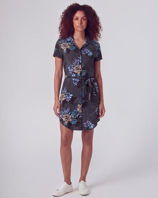 CRYSTAL EXOTIC FLORAL BLACK WOMENS SHIRT DRESS