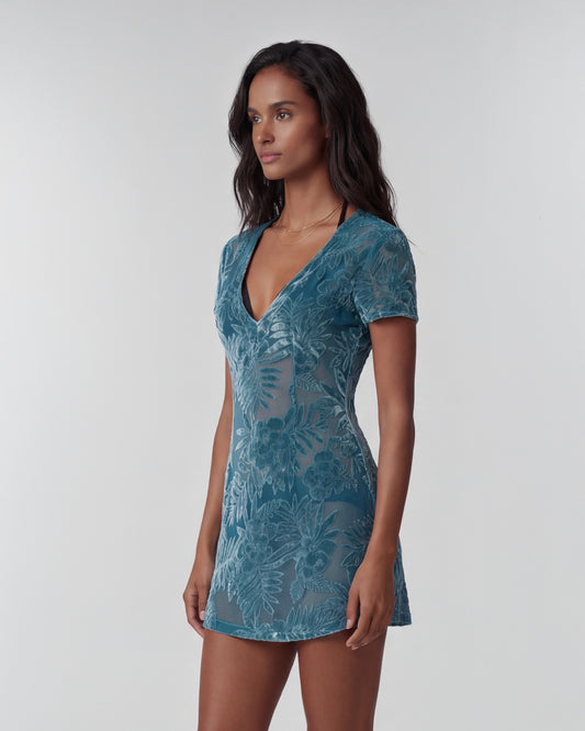 VIOLA COUNTRY FLORAL TEAL WOMENS V-NECK MINI DRESS