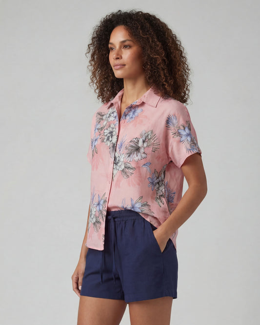 LARA EXOTIC FLORAL CORAL WOMENS LINEN PRINTED SHIRT