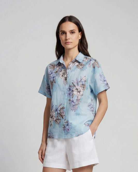 LARA EXOTIC FLORAL TEAL WOMENS LINEN PRINTED SHIRT