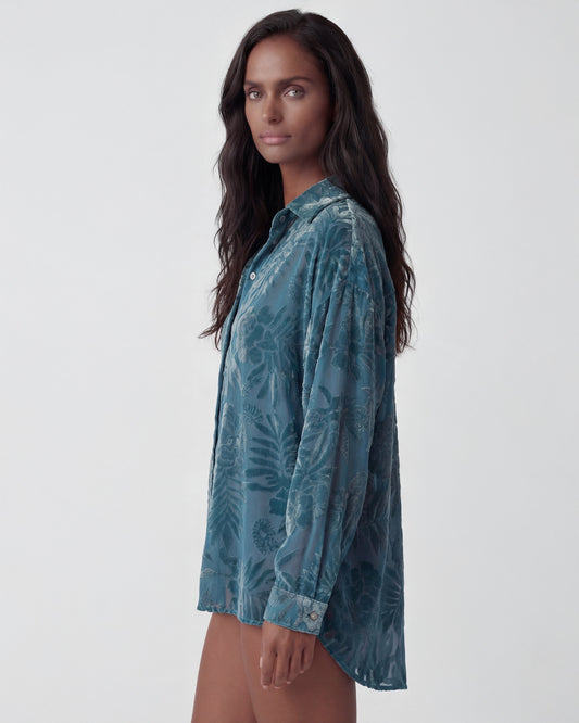 NADIA COUNTRY FLORAL VELVET DEVORE TEAL WOMENS SHIRT