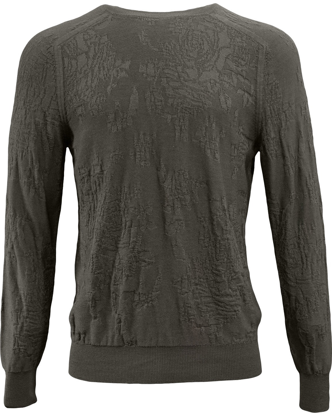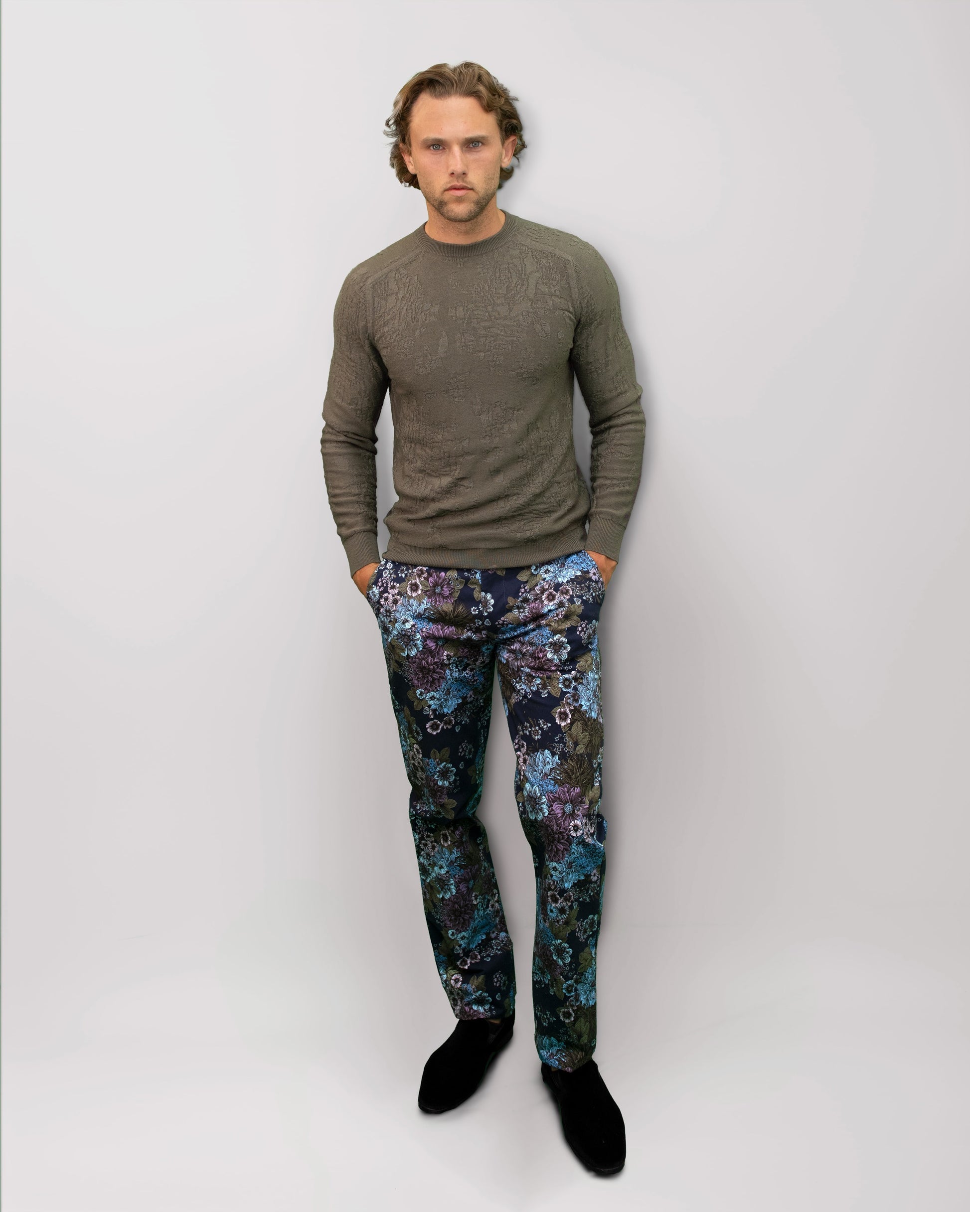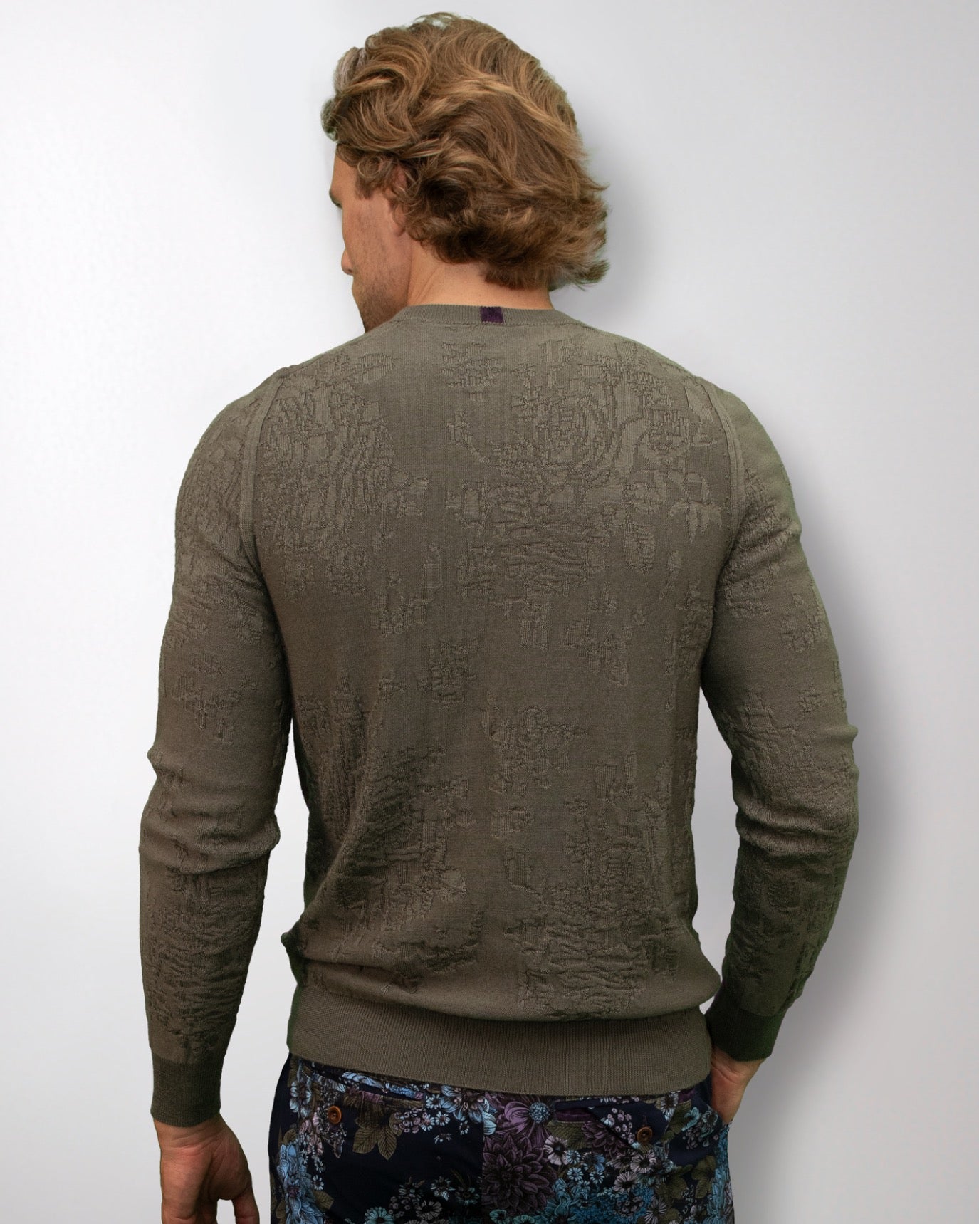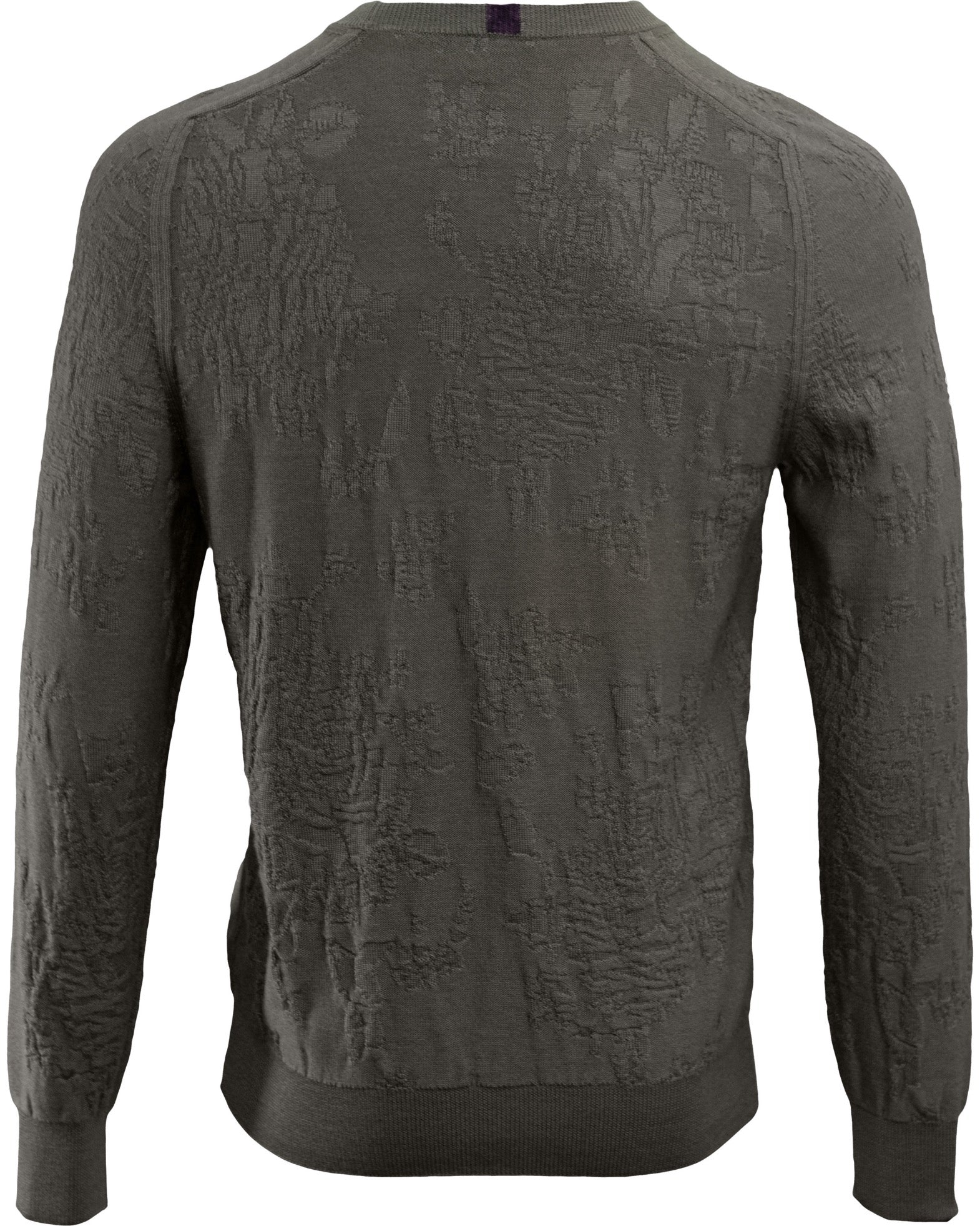 Step up your sweater game with this luxurious paisley crew neck. Crafted from a blend of superfine merino, silk, and cashmere, it boasts a saddle shoulder, ribbed details, and a signature polkadot stripe at the collar's back. Elevate your wardrobe with this elegant, textured piece.