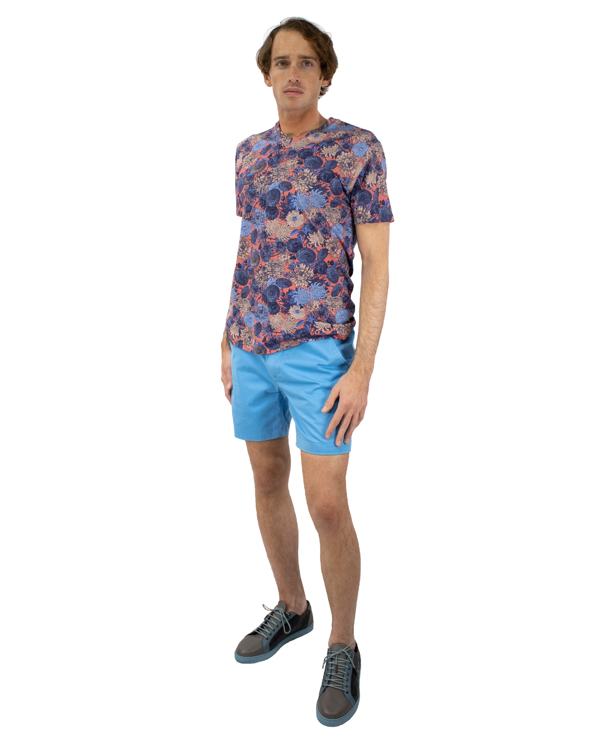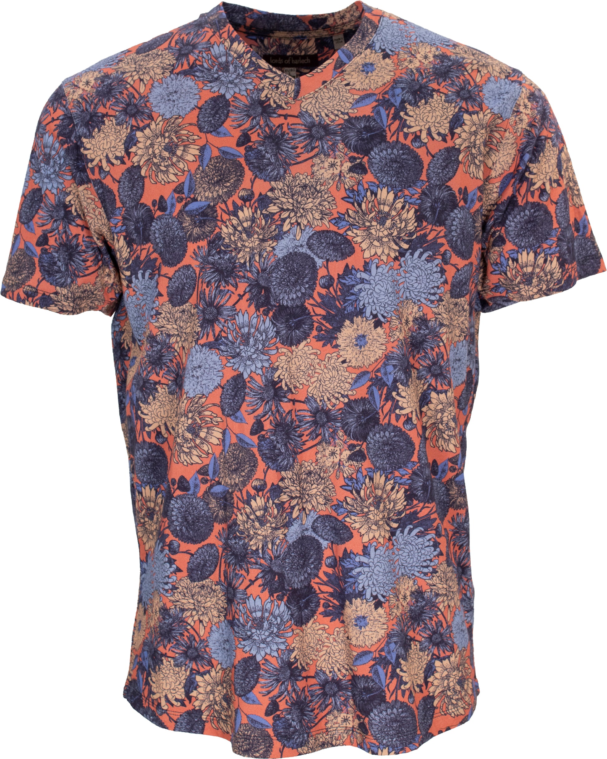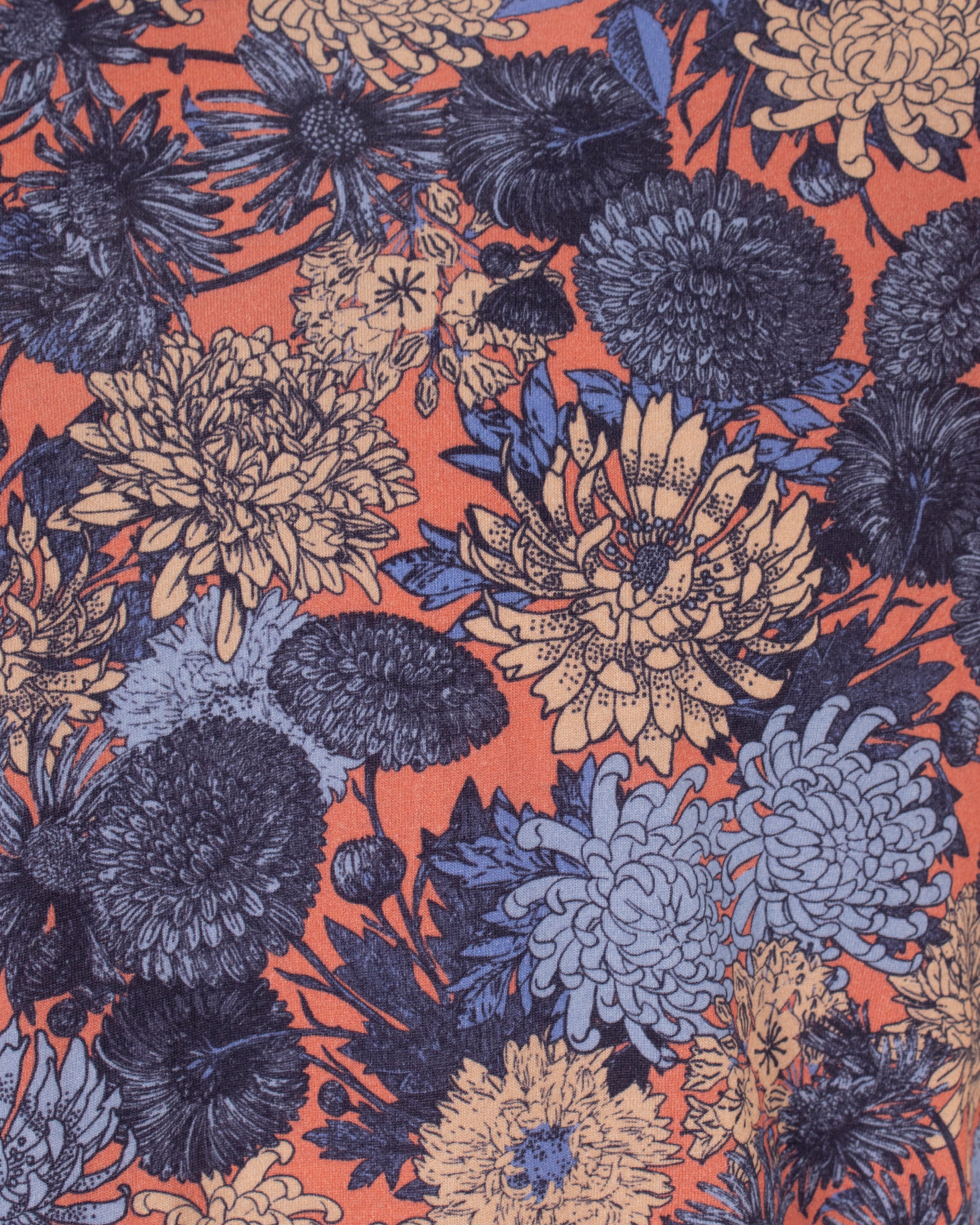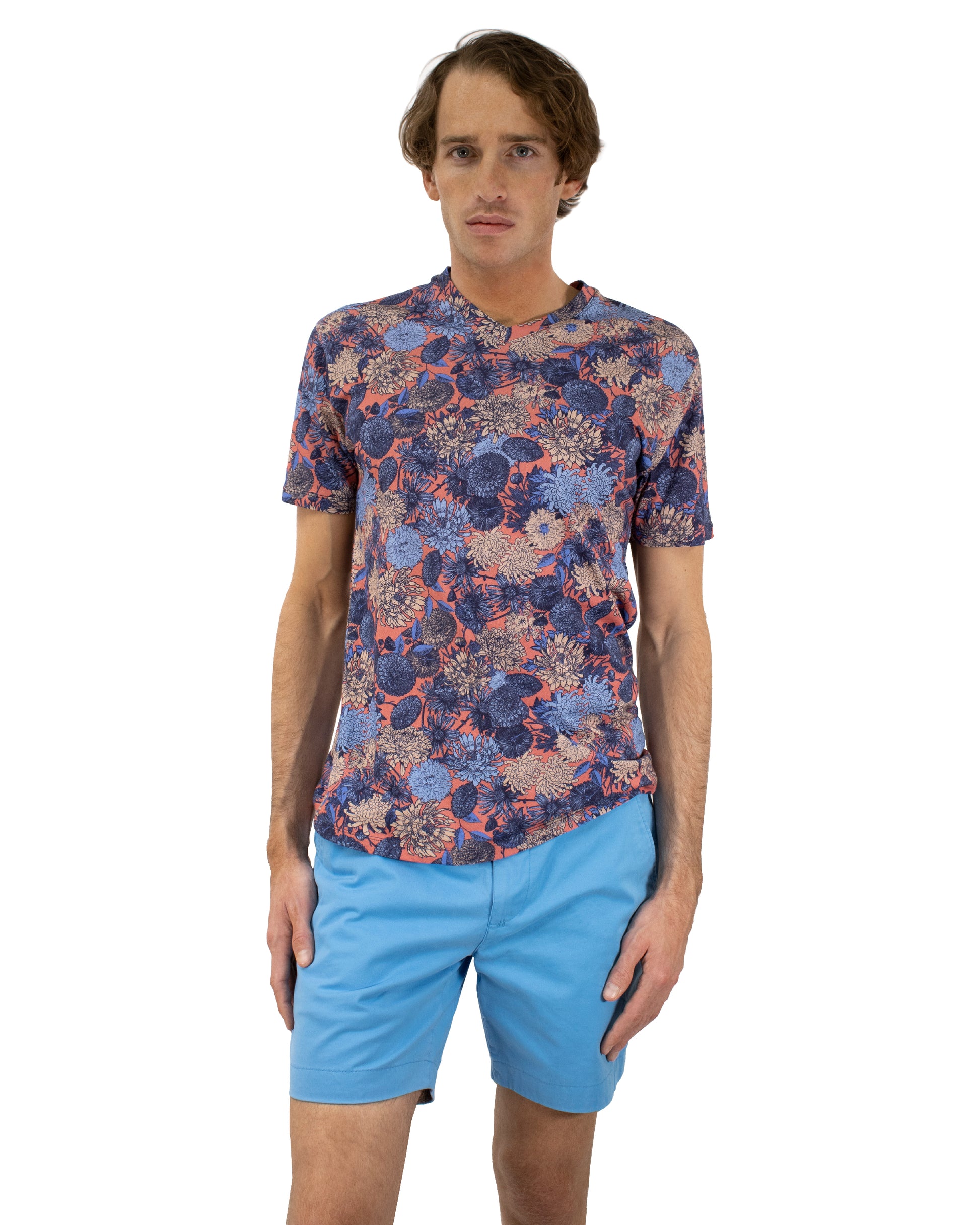 Our classic vneck t-shirt in 60% Cotton 40% Modal. Printed with a floral mum pattern in peach and blues.