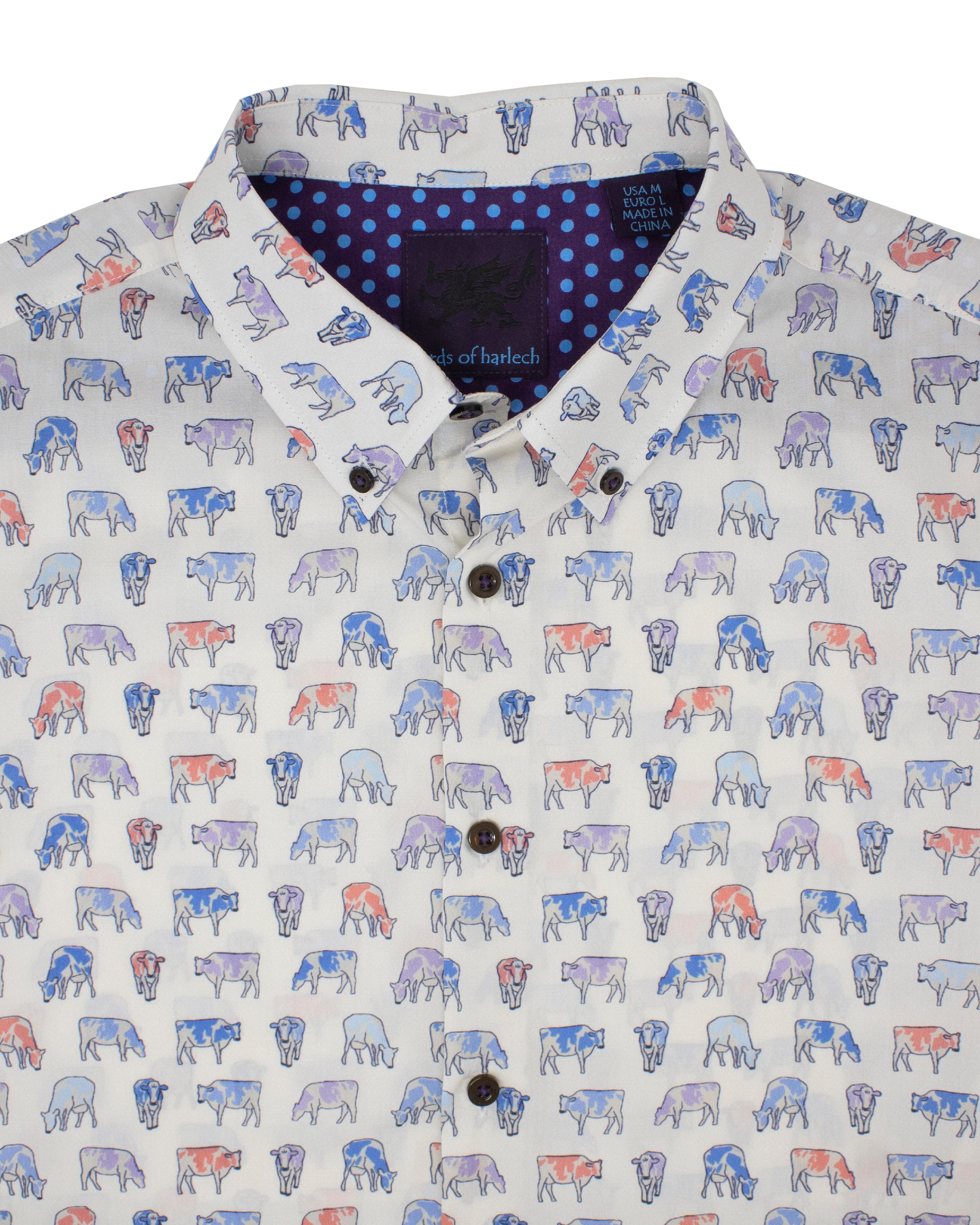 This unique multi-color cow pattern is sure to be a conversation starter. The Mitchell shirt is part of our Dragon brand. This luxurious printed woven shirt has a button down collar and is made with our signature mechanical stretch for comfort and a silky hand feel. Contrasting polka dot in the inside back neck and cuff, exclusive to our Dragon collection.