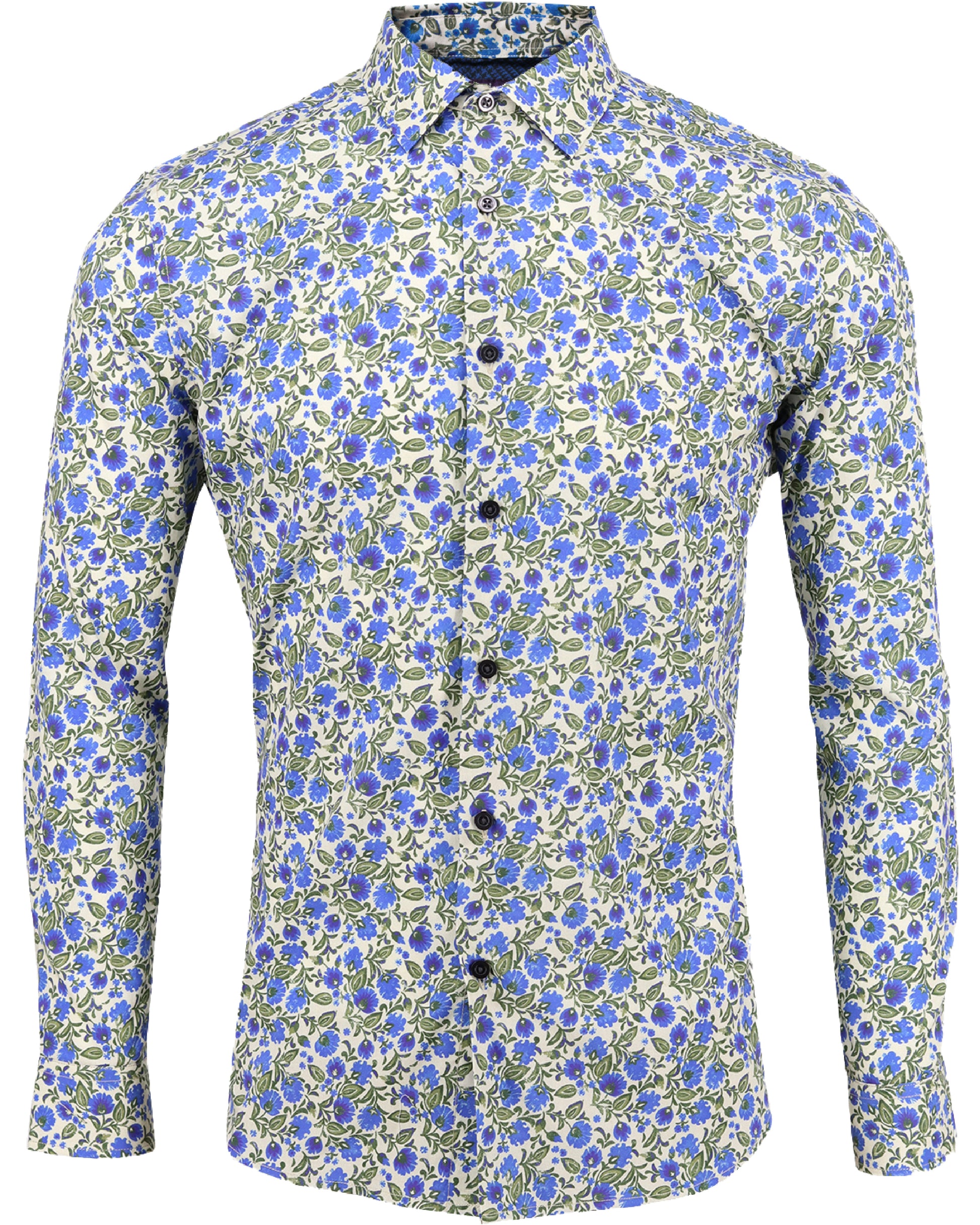 Long sleeved woven shirt with mechanical stretch for comfort. This shirt has a modified spread collar and a tailored fit. Printed in a floral stone blue pattern.