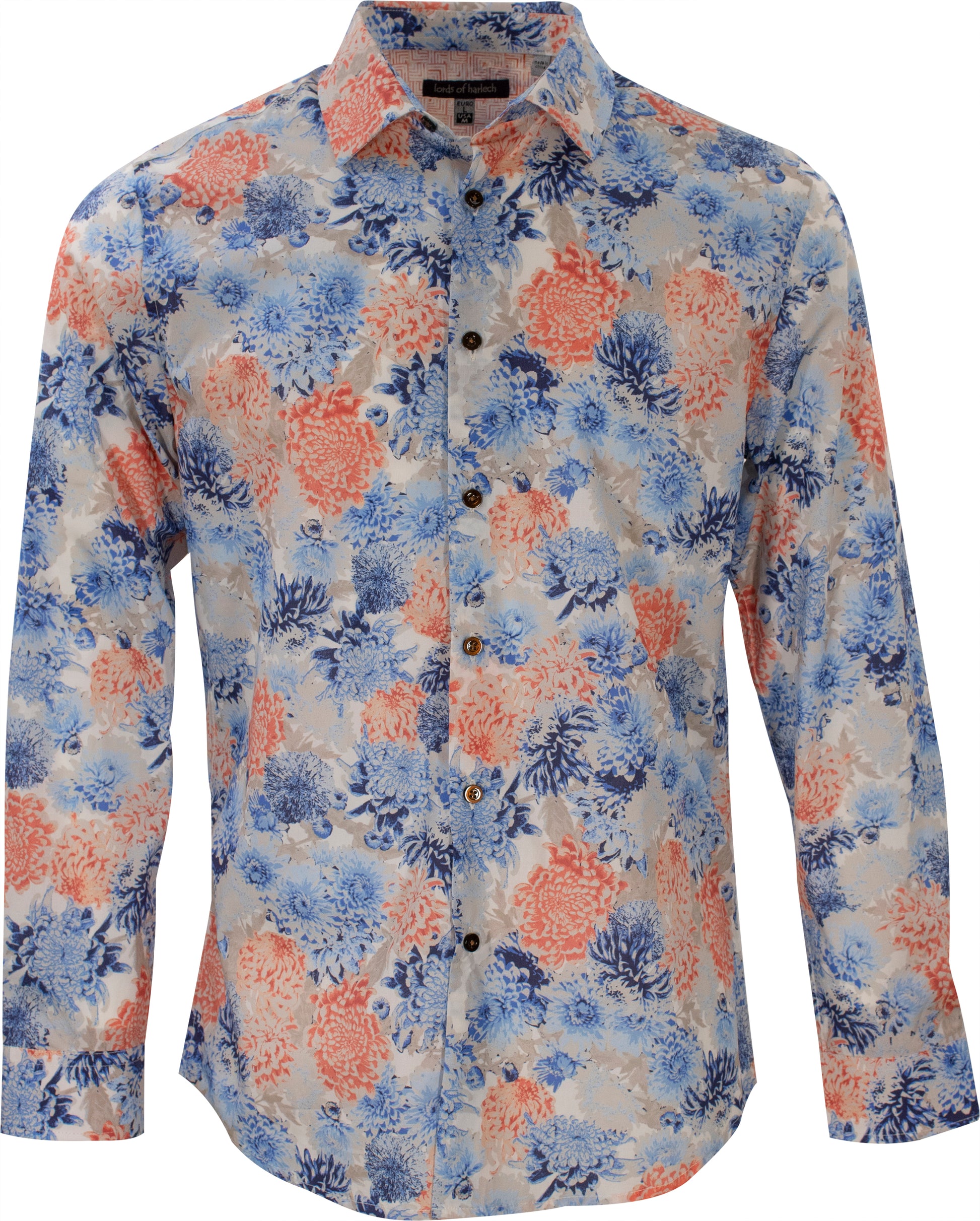 Long sleeve woven shirt with mechanical stretch for comfort. The Nigel shirt has a modified spread collar and a tailored fit. Printed floral pattern in sky blue and coral.