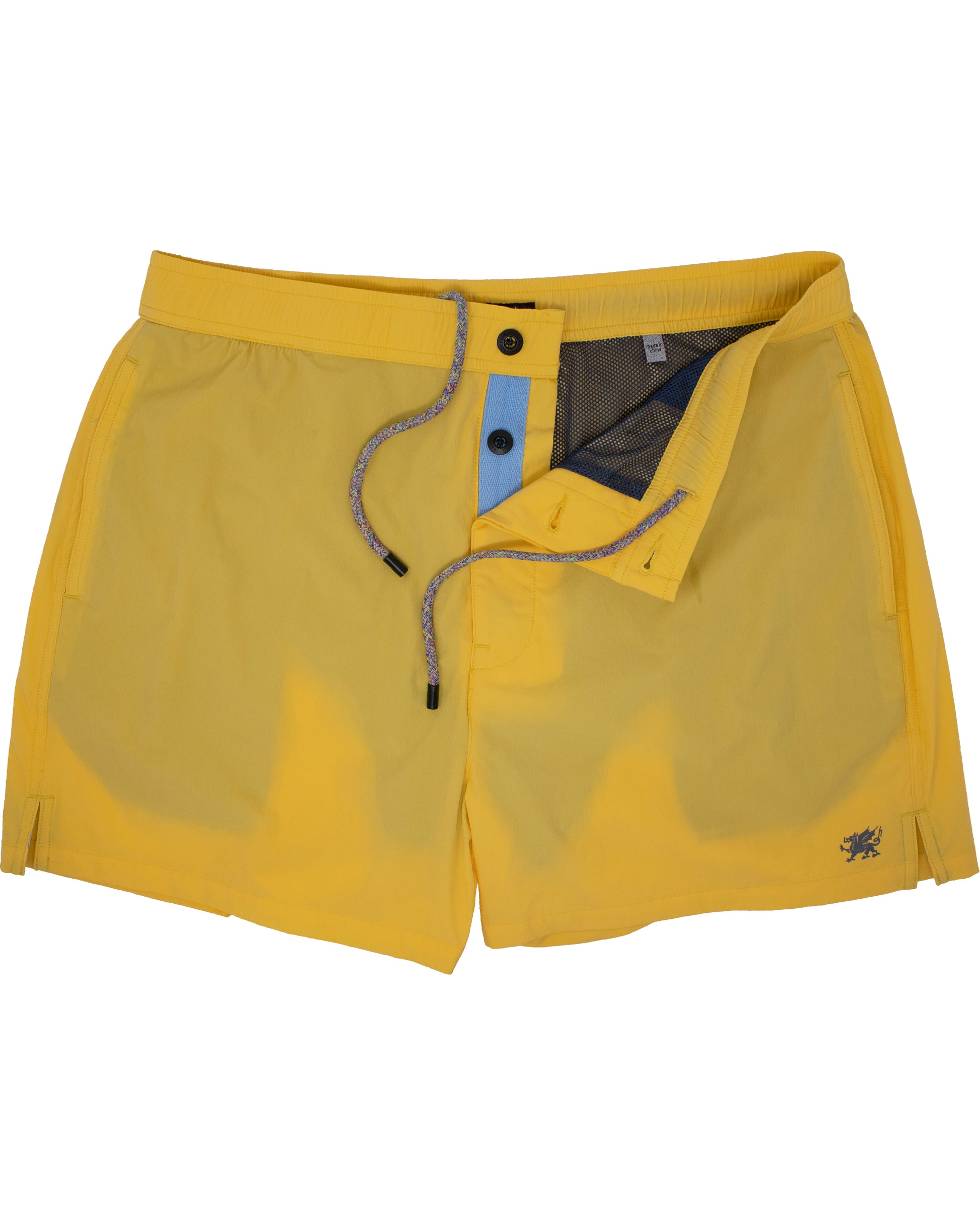 Our nylon and spandex stretch swim trunk has a mesh liner, pockets, button fly and snap closure on the back pocket. Our interior custom multicolor drawstring is unique to the Lords of Harlech. The waistband has limited stretch, for the best fit.