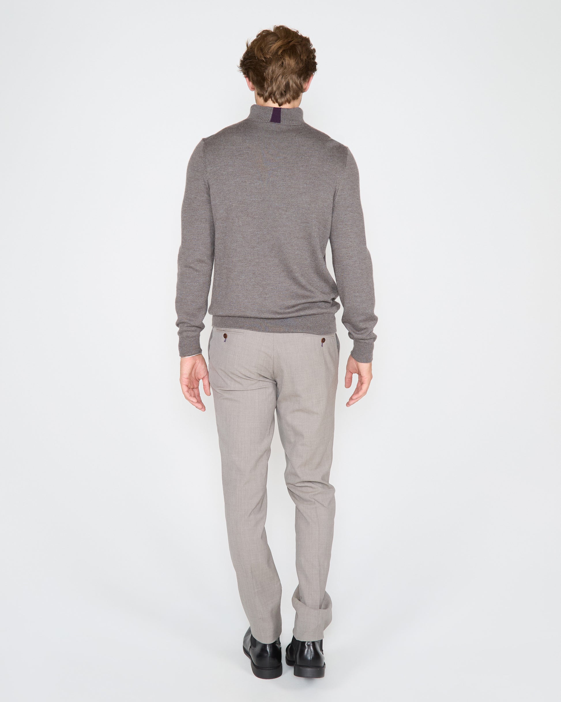 Introducing our luxurious triple color twisted sweater. Made from the finest blend of superfine merino, silk, and cashmere for unparalleled comfort and style. The ribbed cuff, hem, and neck add an elegant touch, while the signature polkadot intarsia stripe at the center back neck collar adds another fine detail to make this a quintessential quarter-zip.