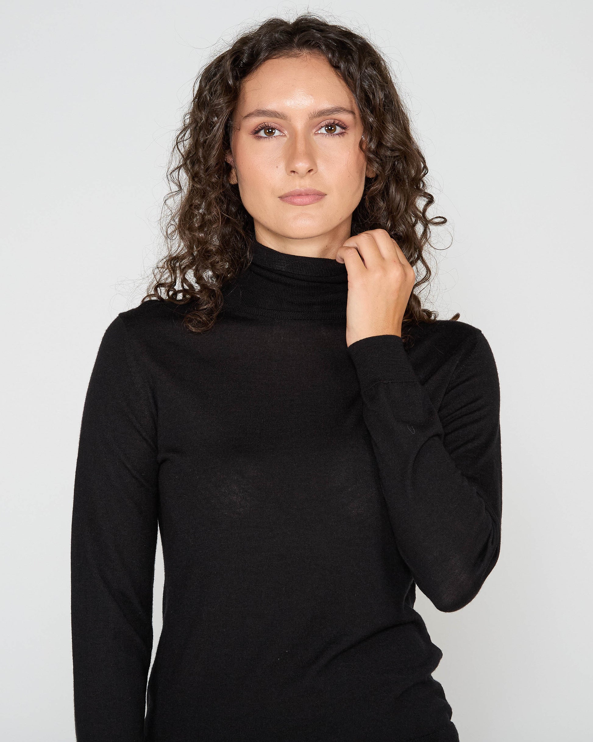 This luxe turtleneck sweater is crafted from a premium blend of merino wool, silk, and cashmere for a feel that?s as elegant as it is effortless. Merino wool provides natural breathability and temperature regulation, while silk lends a subtle sheen and cashmere brings unmatched softness. Finished with a classic fold-over turtleneck and clean lines, this piece layers seamlessly under jackets or stands alone as a polished essential.