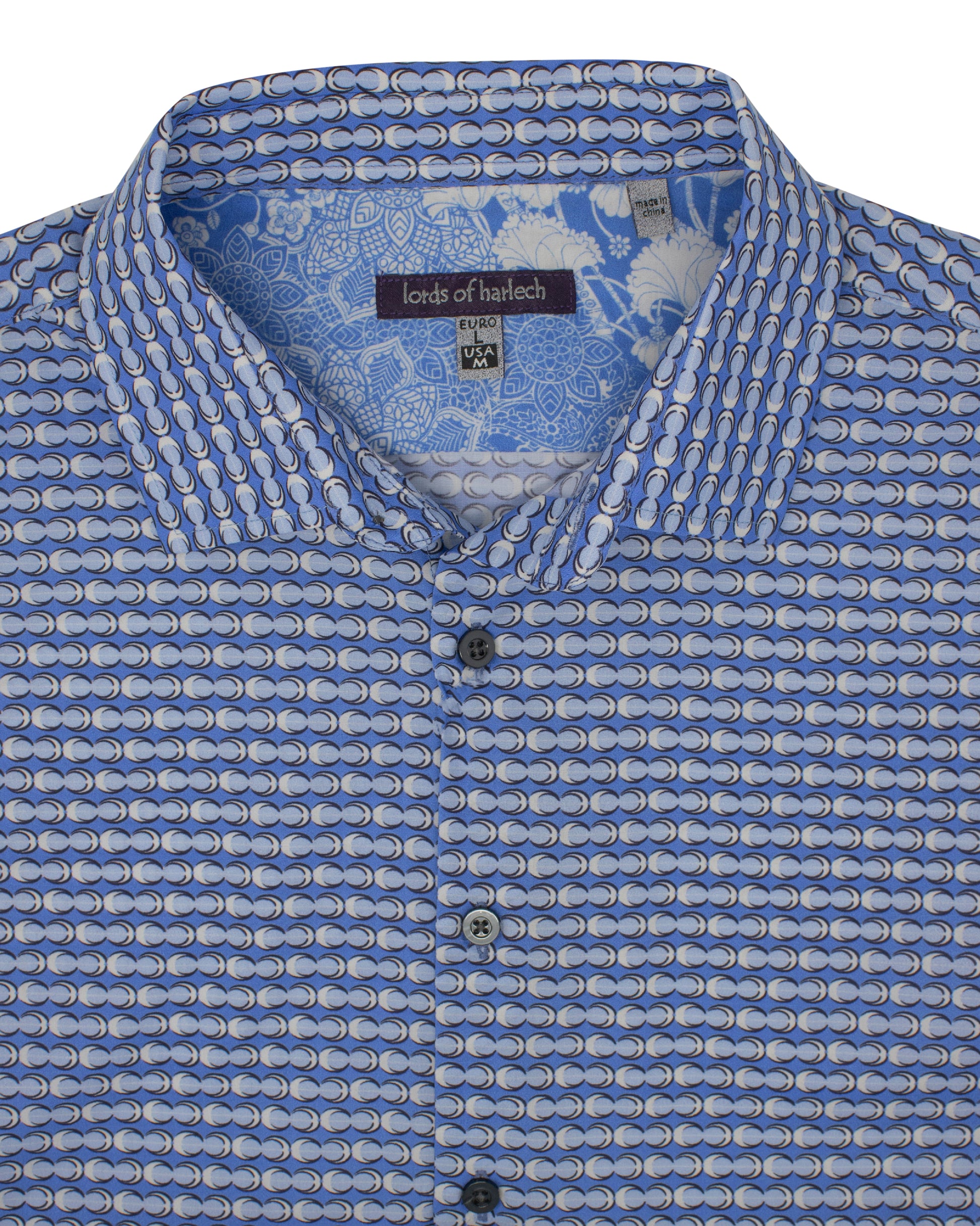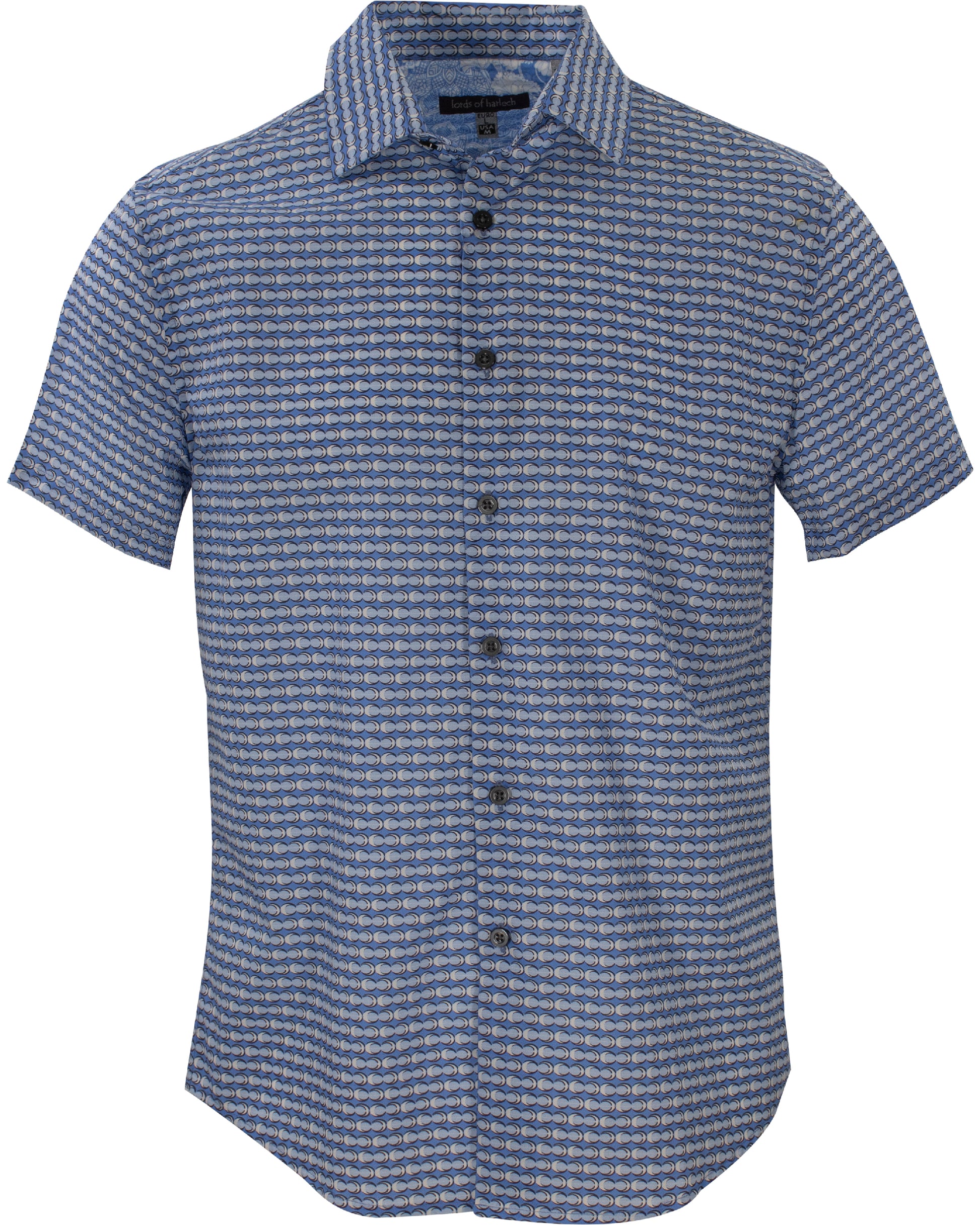 The Scott short sleeve shirt has a modified spread collar; 100% cotton with added stretch and a silky hand finish. Printed in our geo pattern in blue.