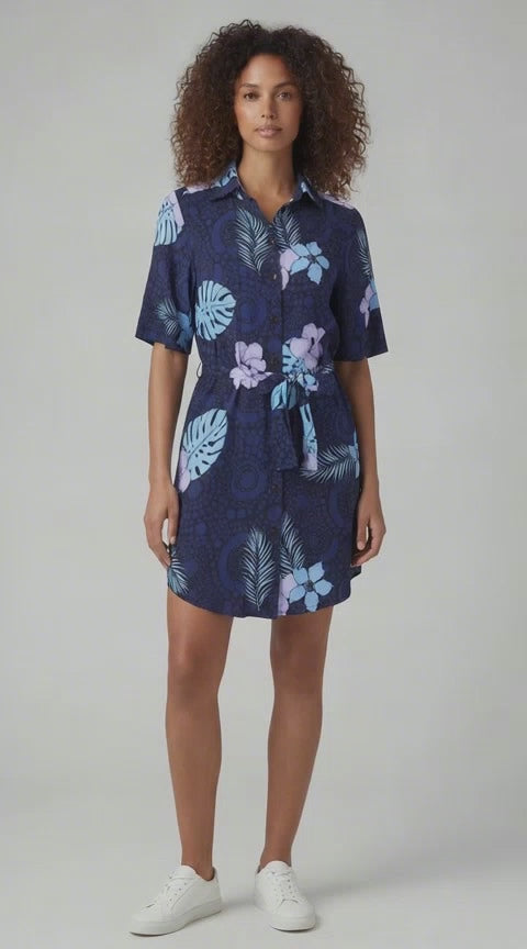 SERENA TROPICAL FANTASY NAVY WOMENS WRAP SHIRT DRESS