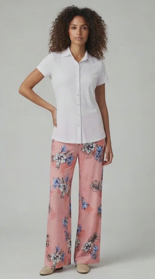 - Short sleeve silhouette with button up placket
