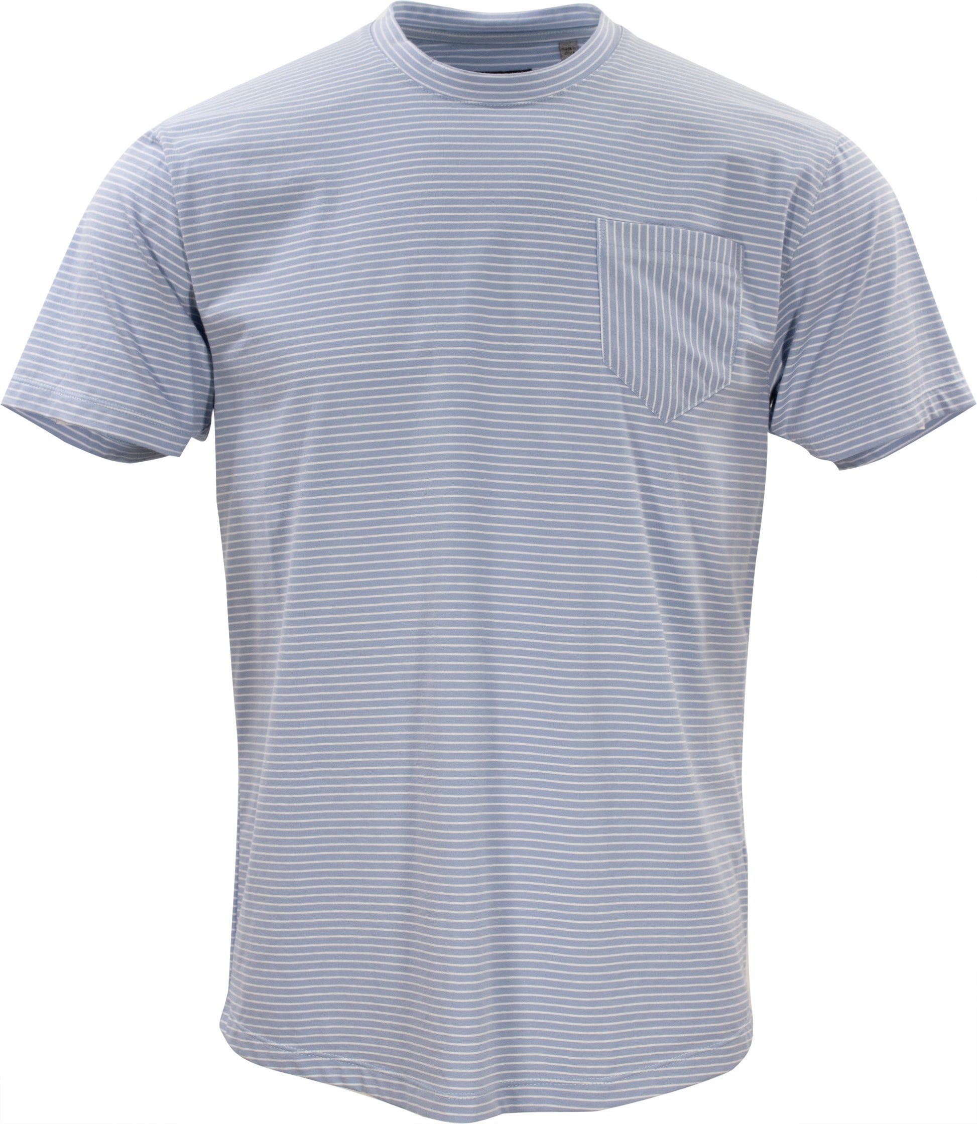 Our Tate crew neck t-shirt is 95% Cotton 5% Spandex to give you the perfect combination of comfort and stretch. This super soft tee is a sky blue and white yarn dyed stripe. The vertical stripe chest pocket adds a nice detail and will become your new favorite tee.