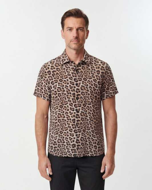 LANDON LEOPARD BROWN MENS LINEN BUTTON-UP SHIRT